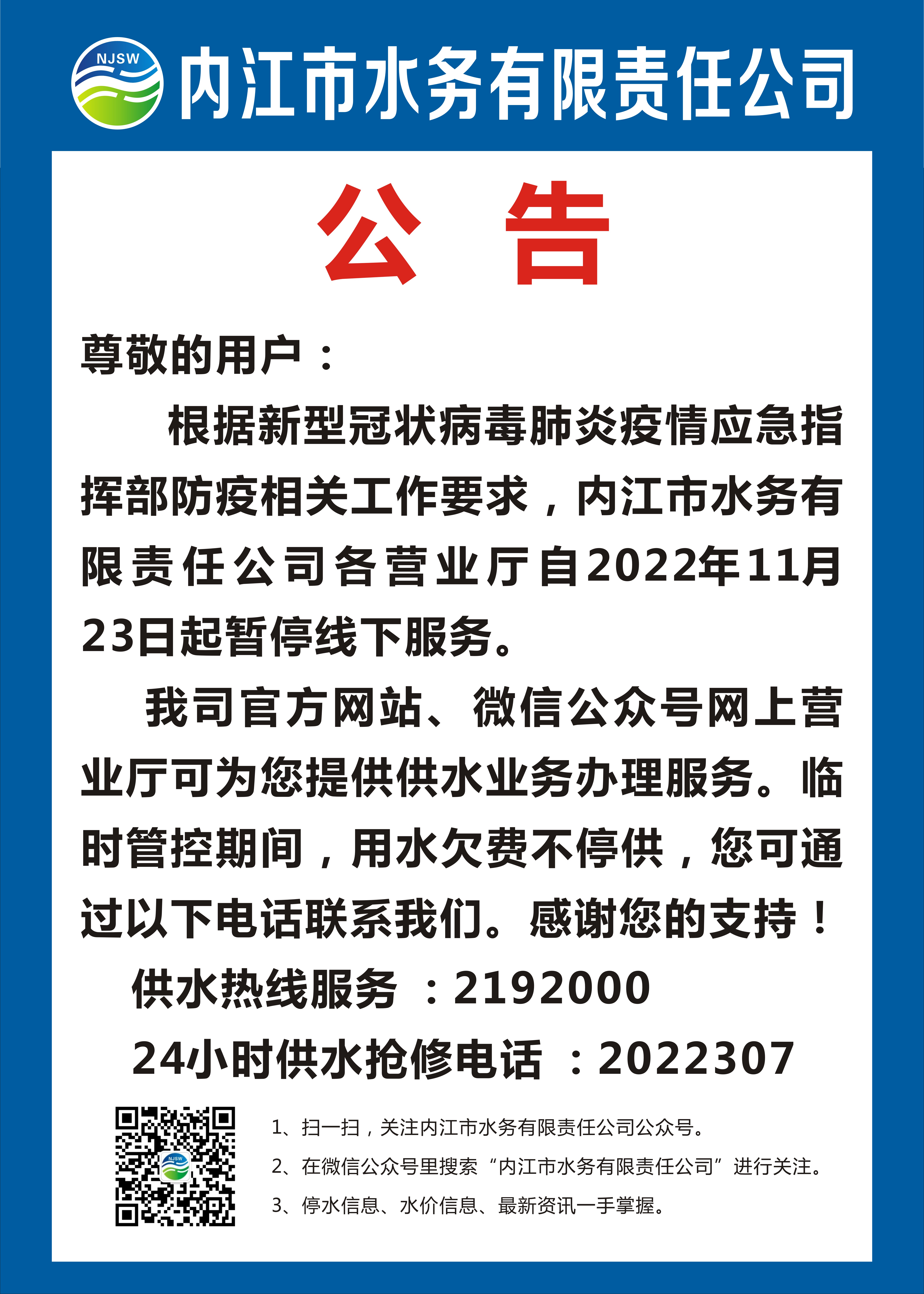 內江市水務有限責任公司疫情防控公告