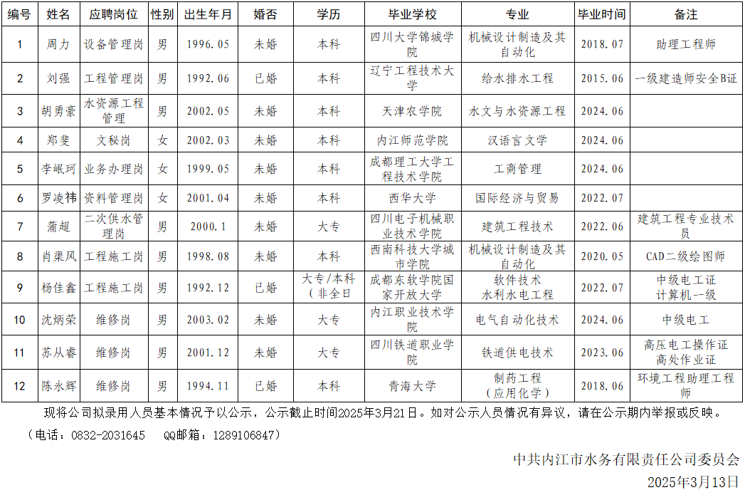 內江市水務有限責任公司2025年3月擬招聘人員公示情況表