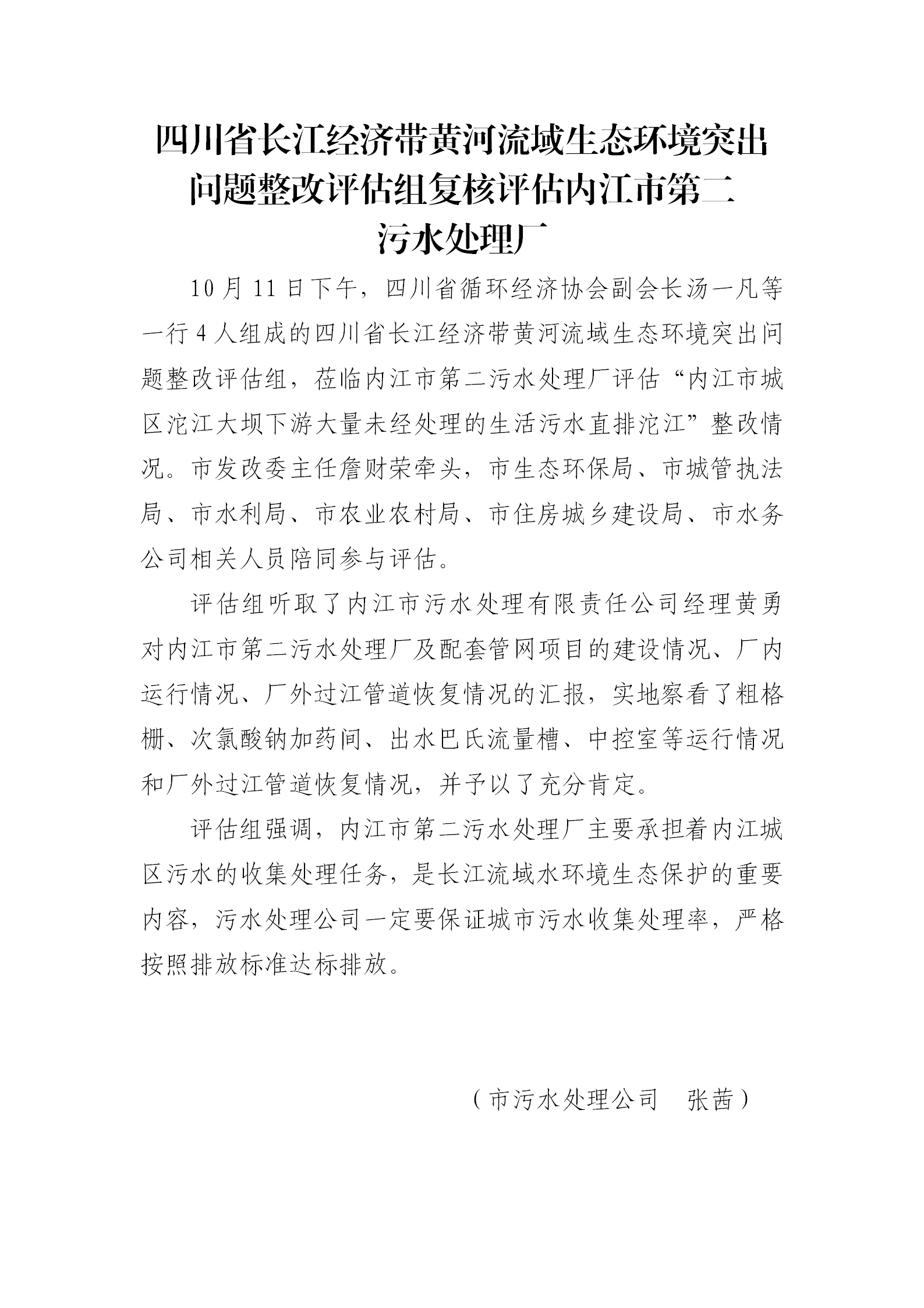四川省長江經(jīng)濟帶黃河流域生態(tài)環(huán)境突出問題整改評估組復(fù)核評估內(nèi)江市第二 污水處理廠